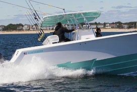 If you are interested in storing a boat with a stepped, performance hull (see above photos), please contact us to discuss storage options. When transported via forklifts, the boat's weight rests entirely on the edges of the steps making them extremely vulnerable to chipping and cracking. We highly recommend that you purchase a special storage rack designed for these hulls. Garrett's Marina Boat Storage exercises great care, but we can't take responsibility for hull damage related to this design. |